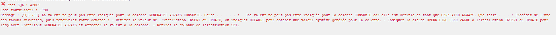 Je souhaite copier une table d’une bibliothèque à une autre cependant, il y a un identifiant entier en GENERATED ALWAYS AS IDENTITY et DB2 ne veut pas copier la table. LE message d’erreur est joint.